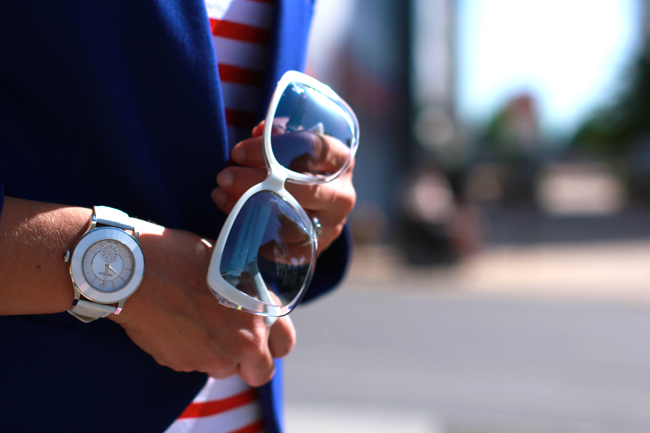 What are you associating with summer? For me it's sunshine, swimming, walking barefoot, balmy nights and a glass of cool white wine. And white pants. Every summer I'm looking forward to wear my white pants or rather to supplement my collection by some new & absolutely necessary models. Therefore I'm dedicating this week to my "white pants collection" and presenting some of my favorite combinations. I'm beginning with a maritime classic: White pants with red-white striped shirt, red sneakers and a blue blazer for cooler nights. - What do you think about white pants? And what's about maritime outfits? Hopefully you like them as me :-) ...